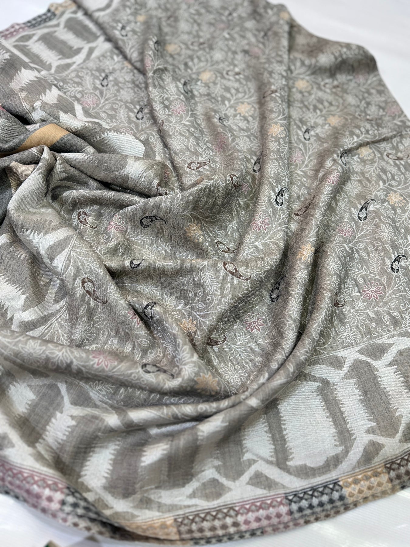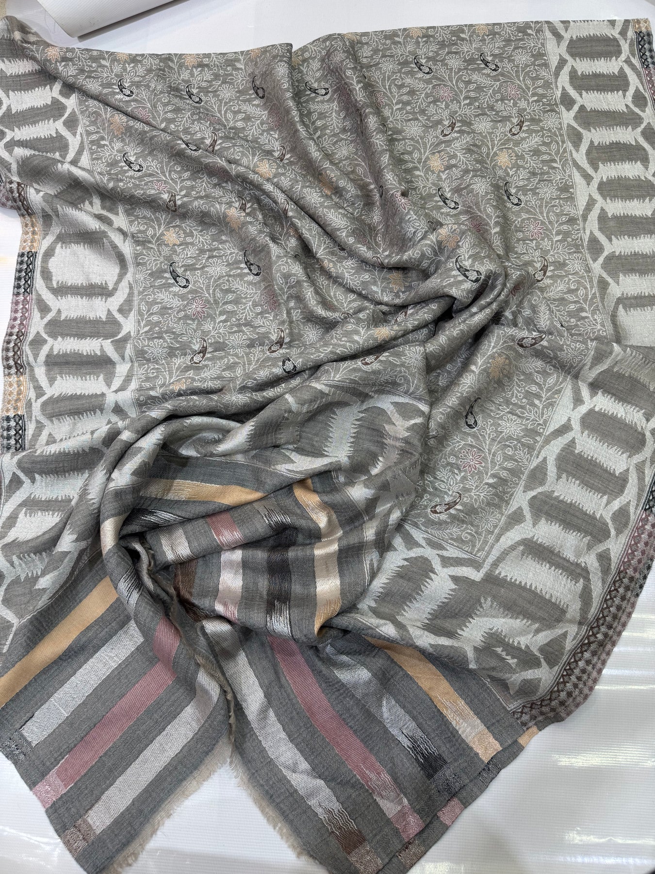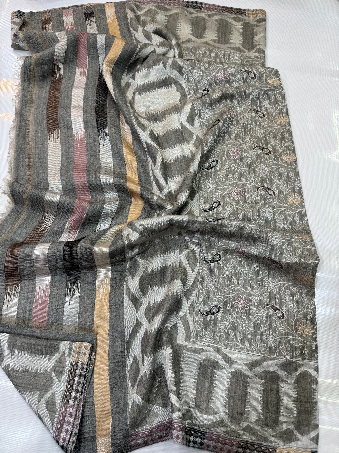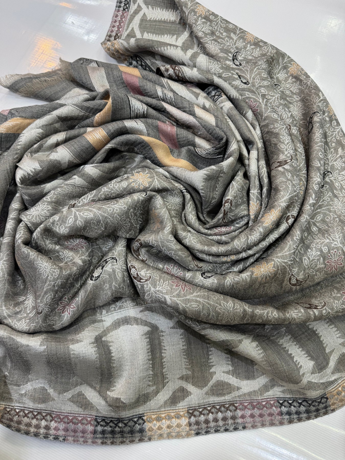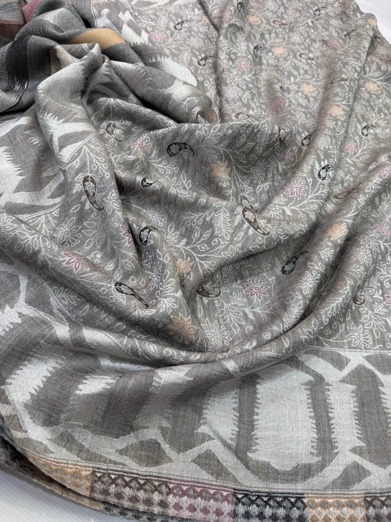 PASHMINA MOONLIGHT IKAT BORDER MOTIF SILVER NEW KANI SHAWL 2.5 GAZ
