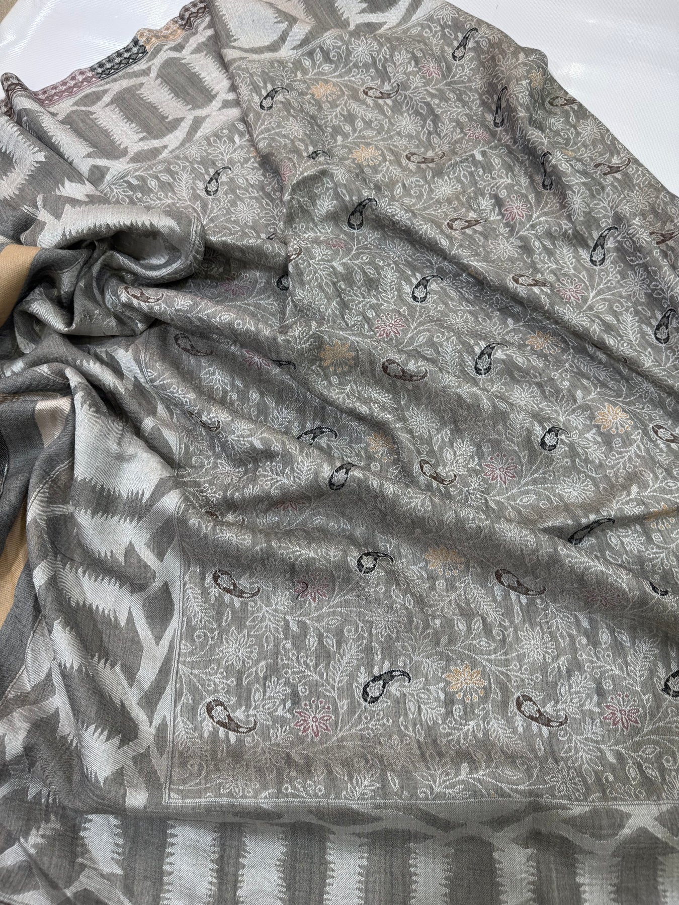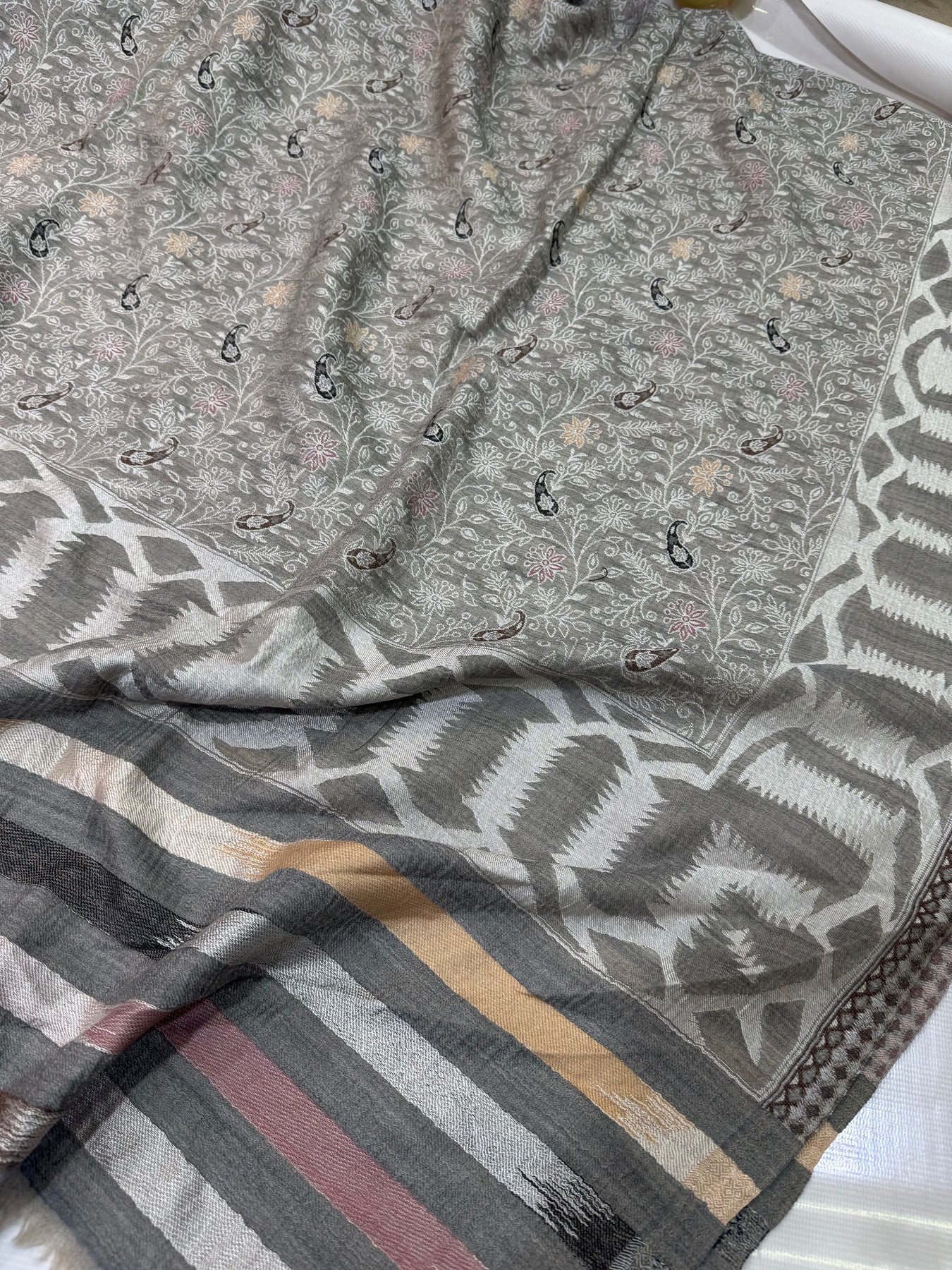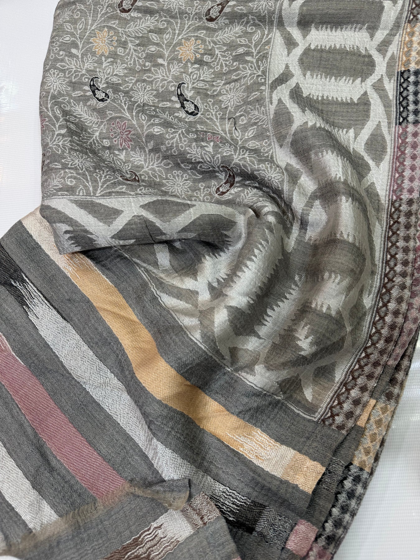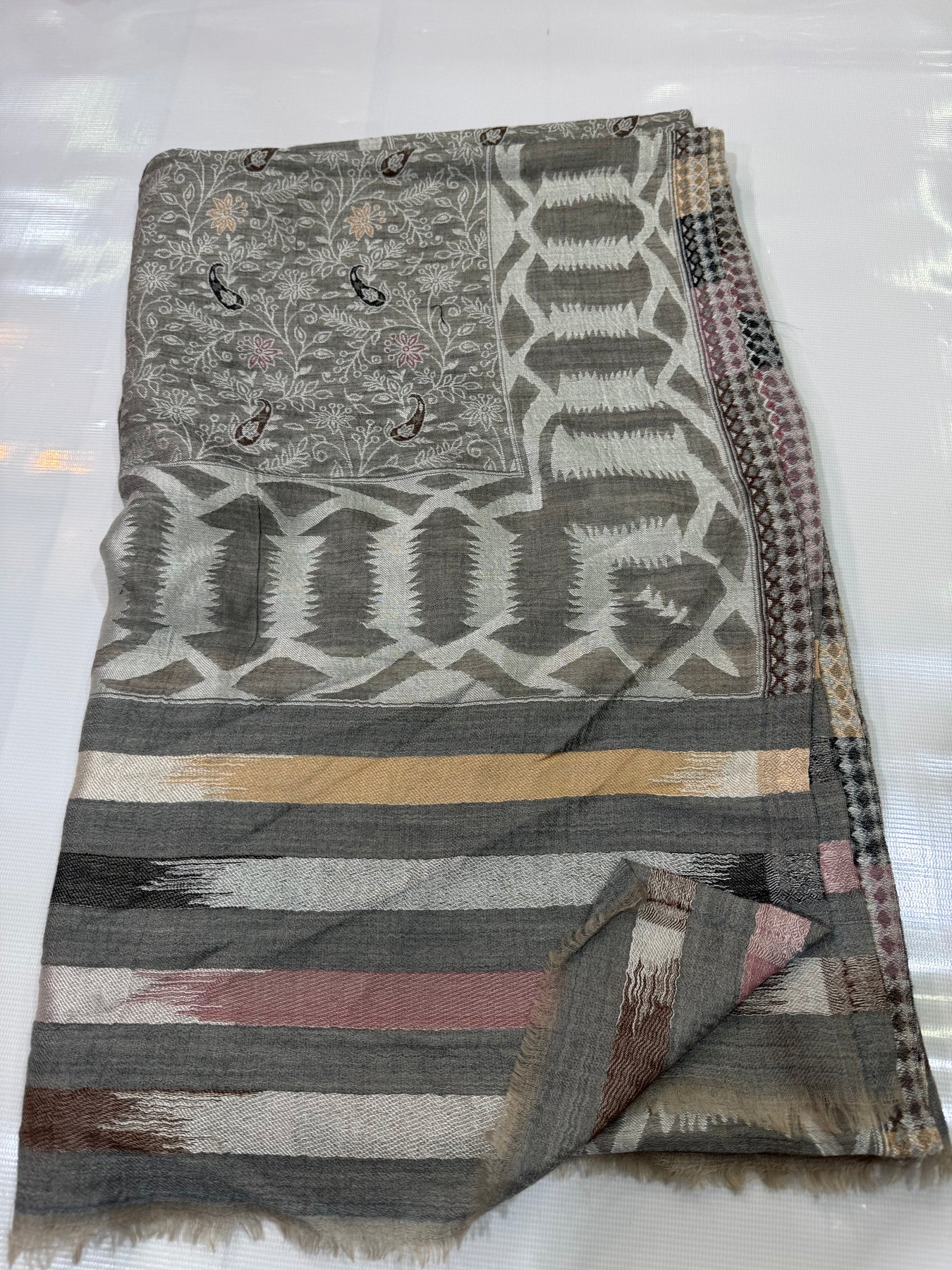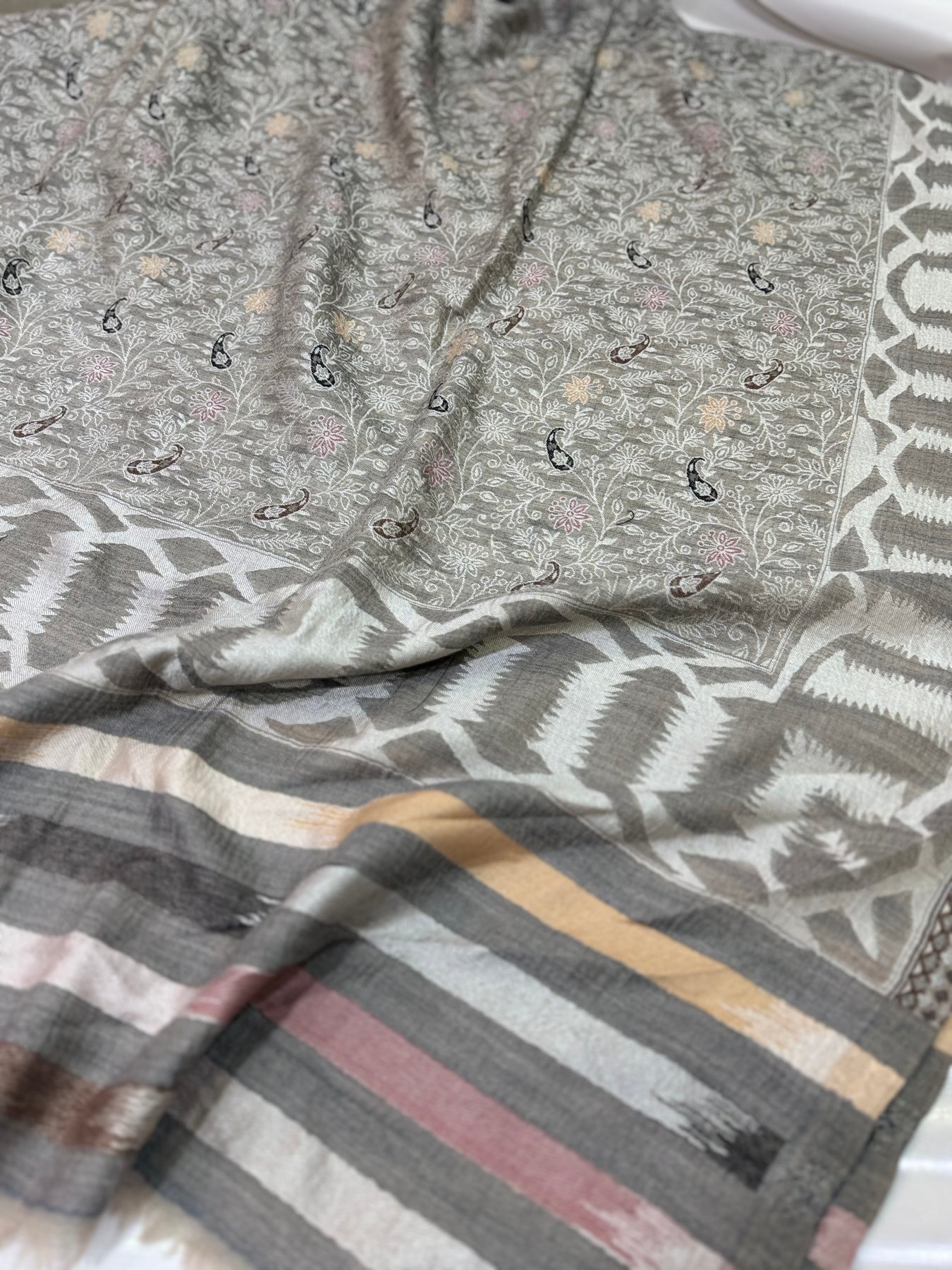 PASHMINA MOONLIGHT IKAT BORDER MOTIF SILVER NEW KANI SHAWL 2.5 GAZ